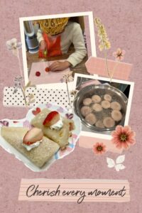 白玉粉につぶしたいちごをまぜて生地を作り、フライパンでクレープのように薄く焼く