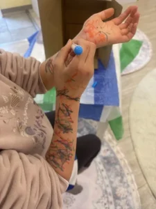 あまりにニコニコ面白そうに取り組んでいたので、服につかないようにスタッフが気をつけながら 満足いくまで手にペインティングしました。