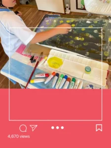 水彩画スタンプアート🎨 2025.06.01 Uncategorized のびのびと自由に色を使って 隙間なく塗り込んで 気持ちいい! それだけではなく ドライヤーで瞬時に乾かして 上から ペットポトルの蓋で作ったスタンプを 絵の具でペタペタ! 白色や黄色をたくさん使って できた作品名は「宇宙の星たち」 空き箱にデザイン✨ 前の記事 オンアロールカードゲーム! 次の記事